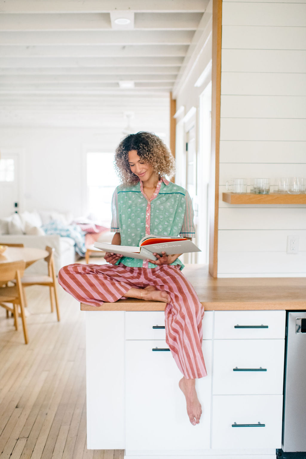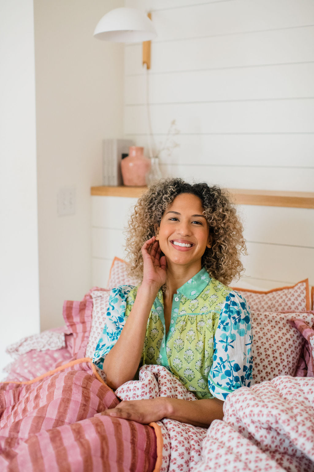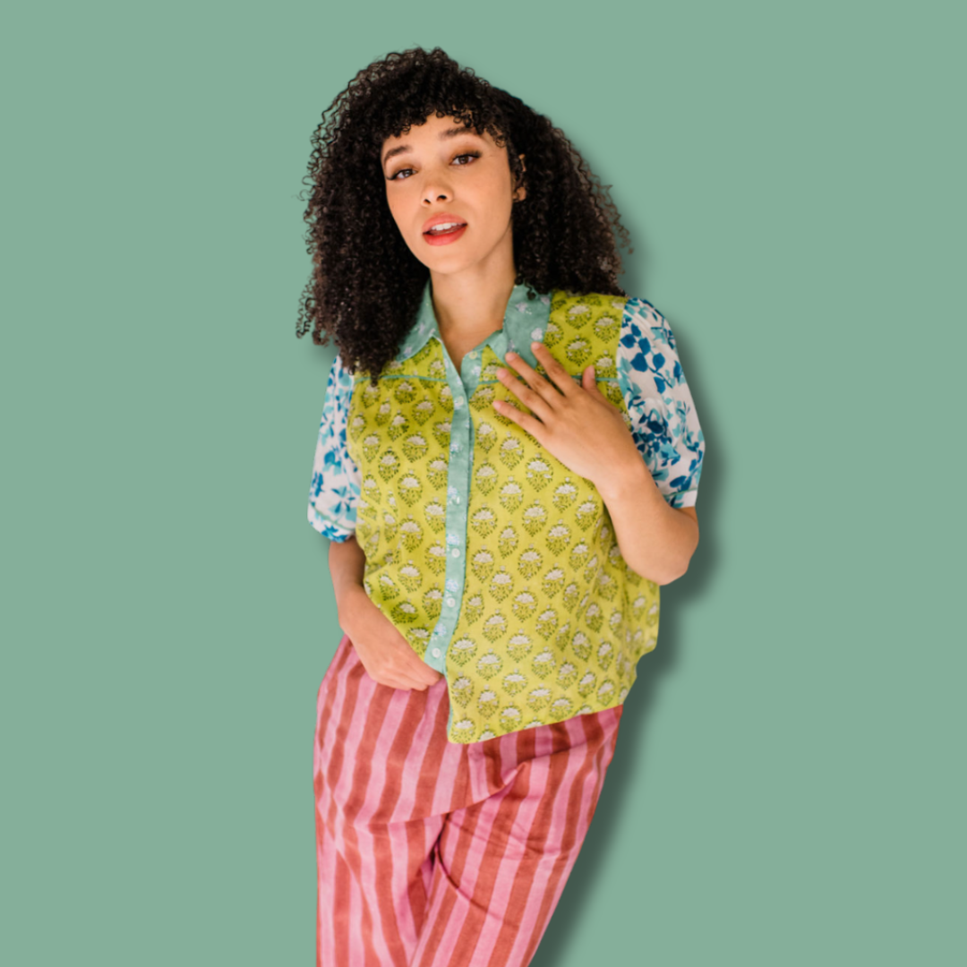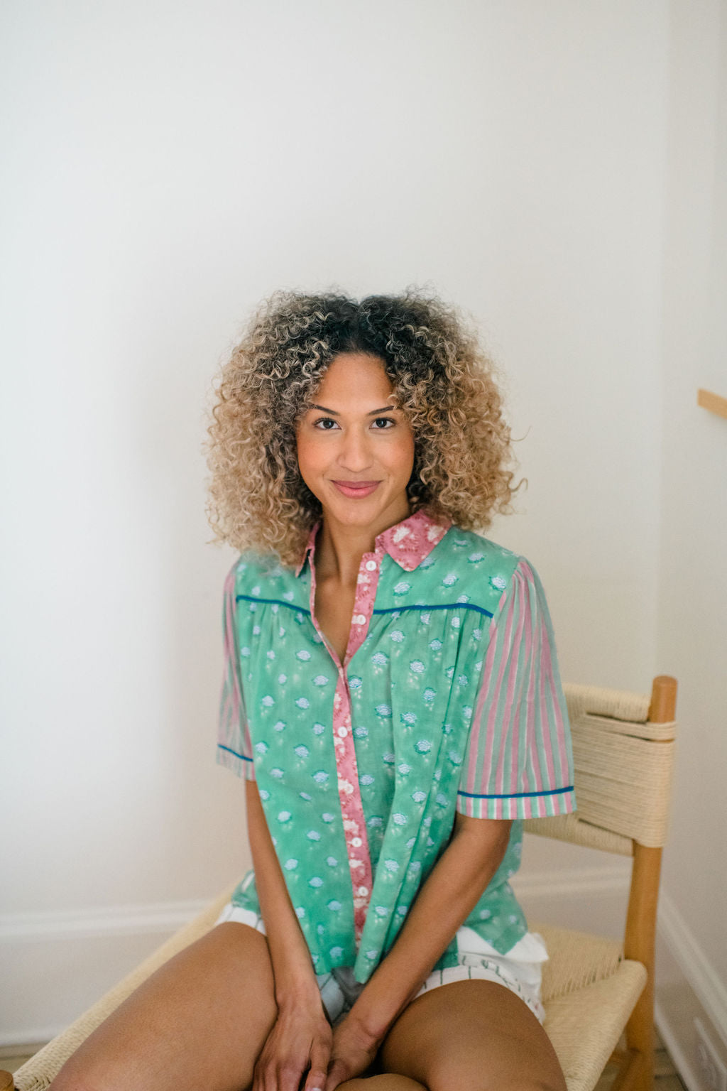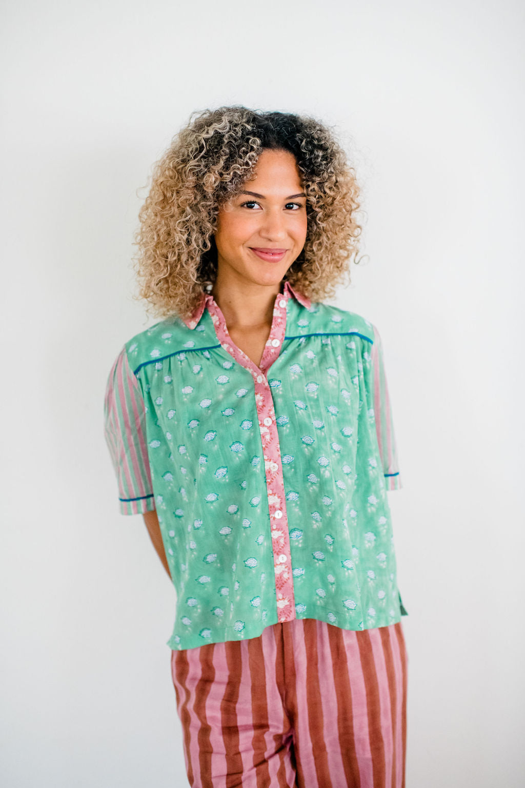The Dorothy Sleep Top is your new go-to for elevated loungewear. With its oversized silhouette, short sleeves, and structured collar, this hand block printed cotton shirt blends timeless tailoring with playful charm. Thoughtful contrast piping and eye-catching prints add dimension to its classic pajama style, making it perfect for slow mornings, cozy evenings, or styling as a casual layer.