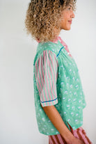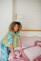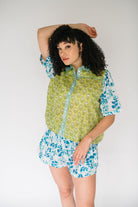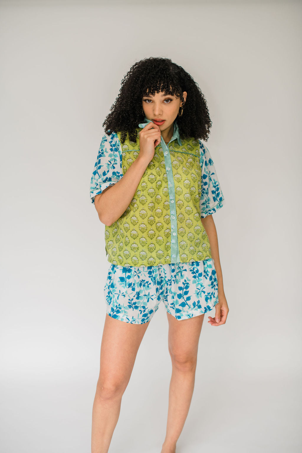 The Dorothy Sleep Top is your new go-to for elevated loungewear. With its oversized silhouette, short sleeves, and structured collar, this hand block printed cotton shirt blends timeless tailoring with playful charm. Thoughtful contrast piping and eye-catching prints add dimension to its classic pajama style, making it perfect for slow mornings, cozy evenings, or styling as a casual layer.